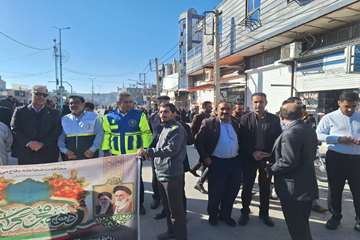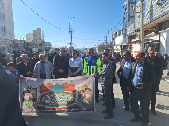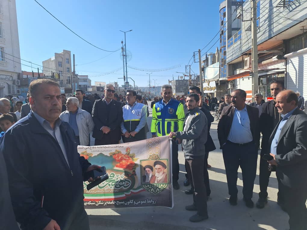 مدیر شبکه بهداشت ودرمان باغملک به همراه همکاران حوزه سلامت همگام با مردم در مراسم راهپیمایی ۲۲ بهمن شرکت نمودند